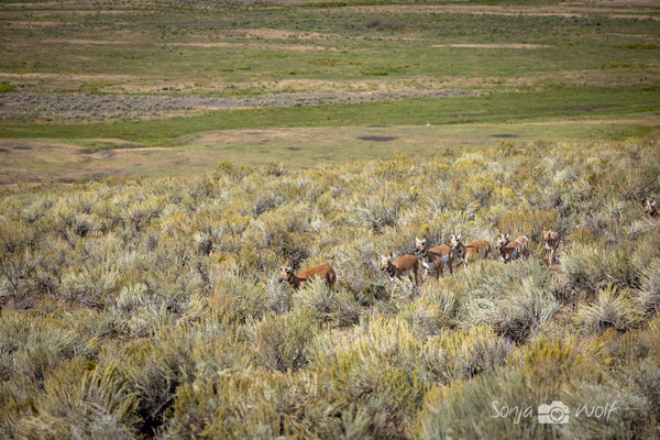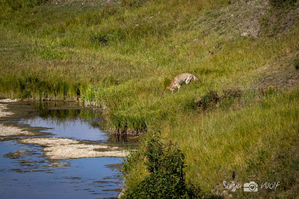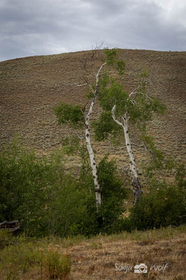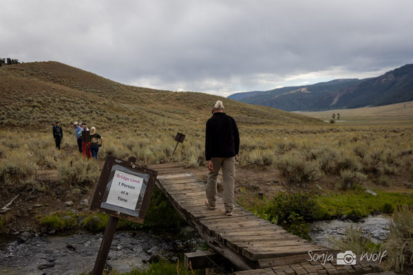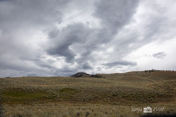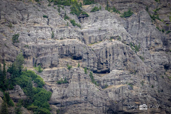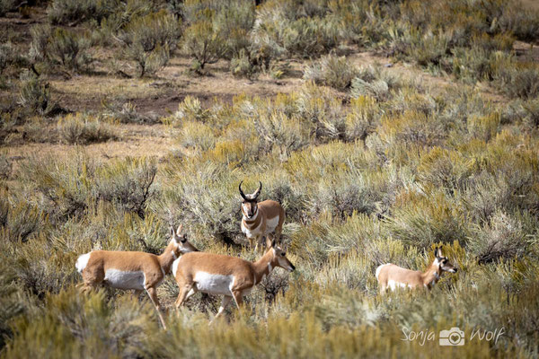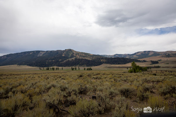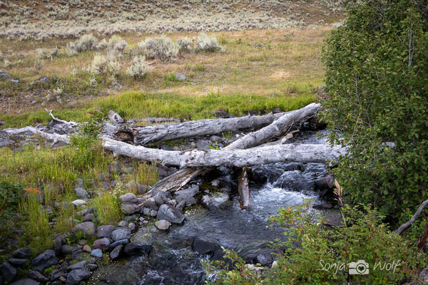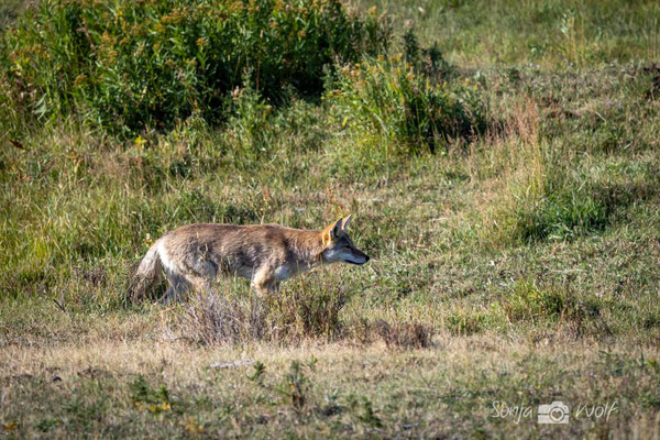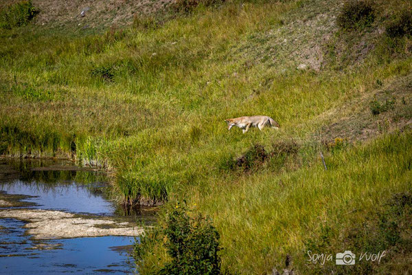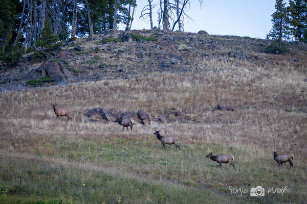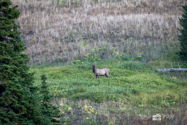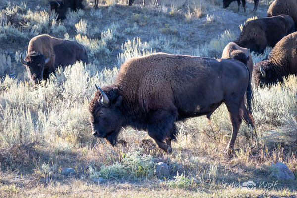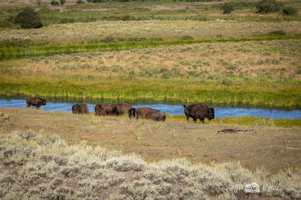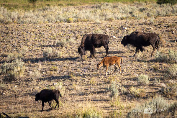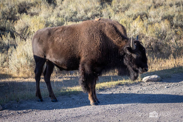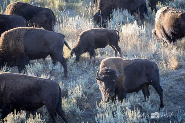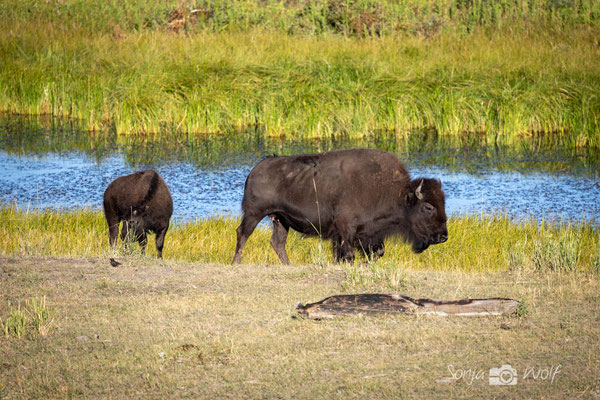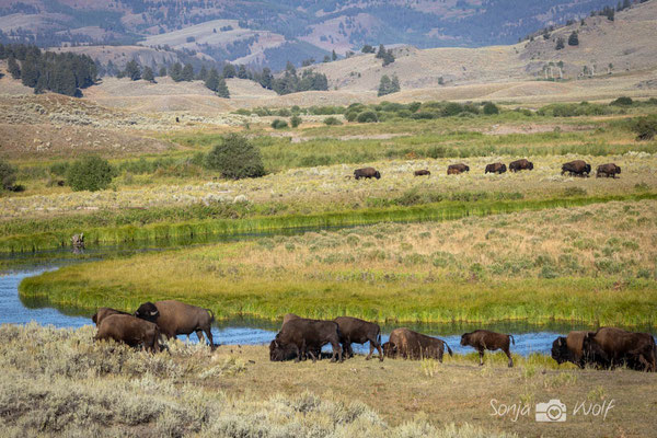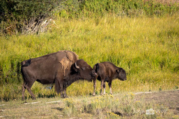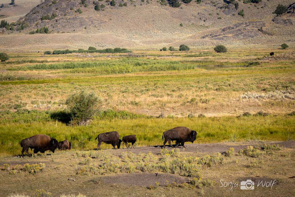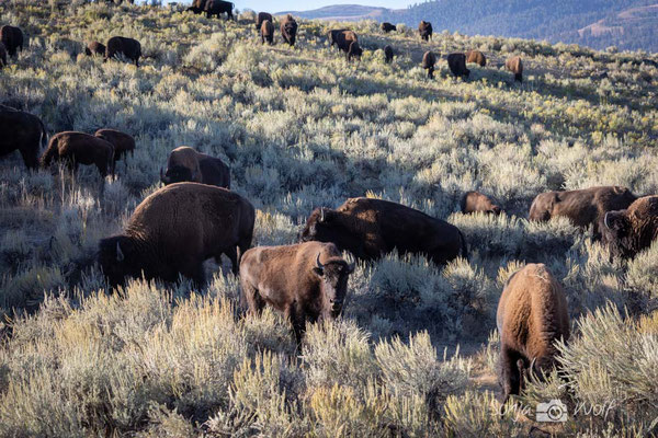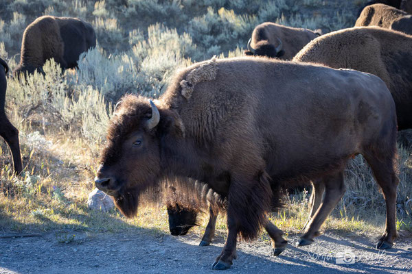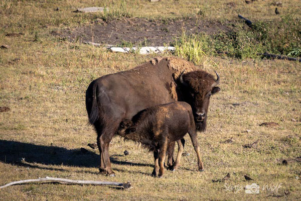 Bisons haben wir heute in großen Herden gesehen. Kälber haben zuerst in hellbraunes Fell, das sie bis zum Winter in das dunklere Fell wechseln. Die Bisons liefen auf und über die Straße und sehr dicht an uns vorbei. Sie tun dies sehr gemächlich und trotzdem bewegt sich eine Herde kontinuierlich weiter. Ich bin immer wieder überrascht, wie schnell sie dann doch vorankommen.