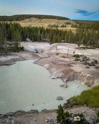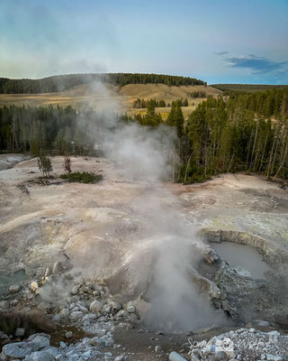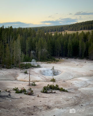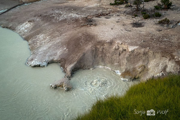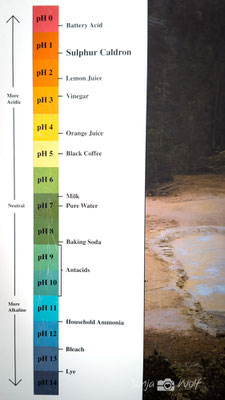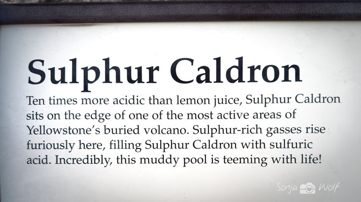 Auf dem Rückweg war die Stimmung ganz anders als tagsüber, wenn alle Touristen versuchen etwas Besonderes zu sehen. Außerdem ist das Licht am Abend viel schöner. Also haben noch bei Sulphur Caldron angehalten. Es riecht intensiv nach Schwefel und in dem kleinen See blubbert es kontinuierlich. Ich habe die Infotafel abfotografiert.