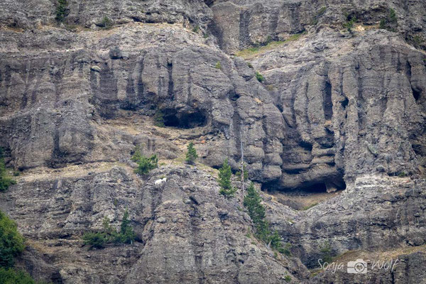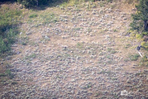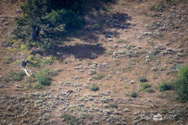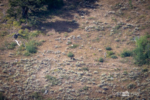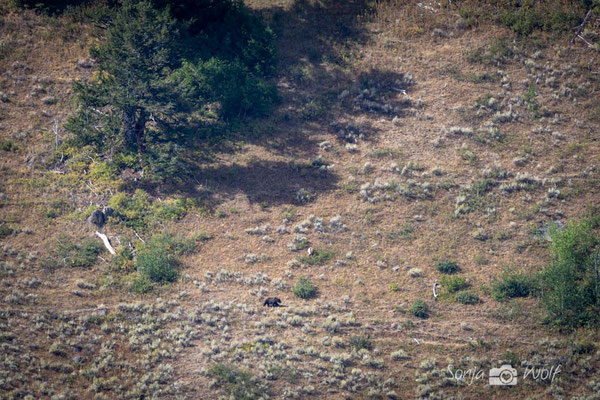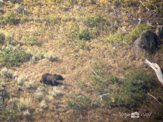Wir haben tatsächlich eine Grizzlybärin mit ihrem Nachwuchs gesehen. Allerdings waren sie auf einem gegenüberliegenden Hang und mit dem bloßen Auge nicht zu erkennen. Nur mit dem Fernrohr konnte man die beiden Bären beim Fressen beobachten. Diese Bilder habe ich mit meinem 500 mm-Teleobjektiv aufgenommen und dann noch um die Hälfte zugeschnitten - trotzdem sieht man nur einen kleinen dunklen Punkt und einen helleren Punkt auf dem Hang. Das zeigt deutlich, wie groß die Landschaft hier ist. Eigentlich hatten wir nicht das Gefühl, dass wir so weit weg waren. Das letzte Bild wurde von einer Teilnehmerin durch ein Fernrohr fotografiert wurde. Da sieht man den jungen Grizzlybären gleich viel besser.