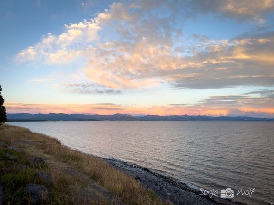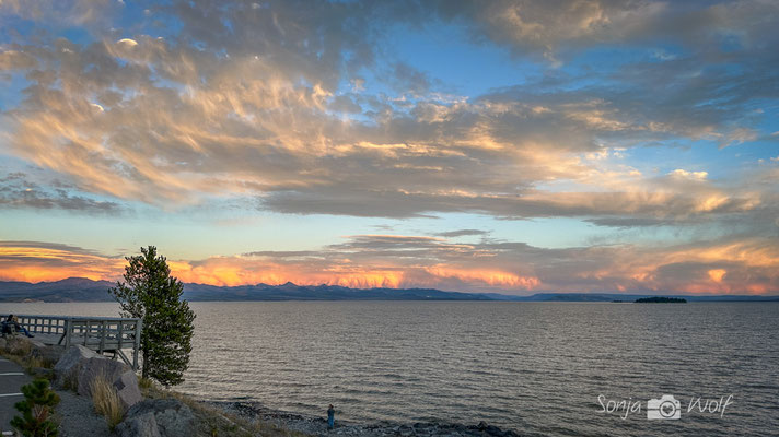 Die Verpflegung in der Canyon Lodge ist sehr einfach und für einen Urlaubsabschluss meiner Meinung nach nicht angemessen. Ich hatte dies schon im Vorfeld recherchiert und eine Reservierung im Lake Yellowstone Hotel Dining Room vorgenommen. Hier gab es eine ordentliche Speisekarte und wir haben den Abend sehr genossen. Zufälligerweise war dan dem Abend bei uns in der Canyon Lodge kein Essen in der Eatery möglich, da es dort ein Wasserproblem gab. Alternativ wurden Hamburger und Hot Dogs ausgegeben. Da waren wir sehr froh über die Reservierung, auch wenn wir nochmal 35 Minuten (ohne Bison-Stau) oneway fahren mussten. Belohnt wurden wir mit einem schönen Abendhimmel.
